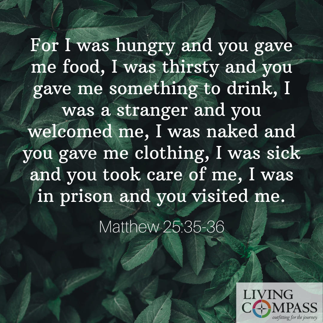 For I was hungry and you gave me food, I was thirsty and you gave me something to drink, I was a stranger and you welcomed me, I was naked and you gave me clothing, I was sick and you took care of me, I was in prison and you visited me.