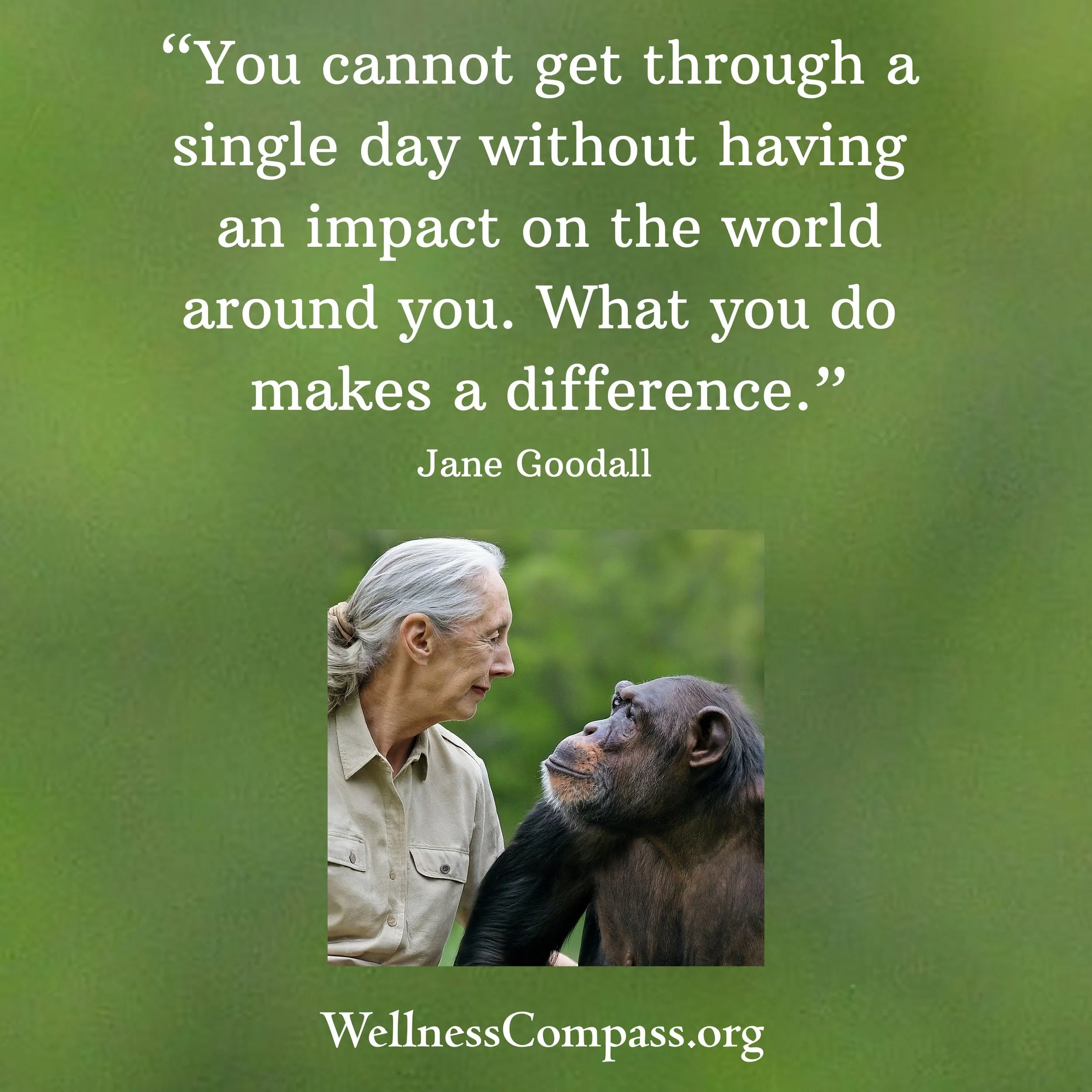 Here, Dr. Goodall reminds us always to be aware of the impact our actions and words have on ourselves and those around us. This quote brings to mind two quotes from our Wellness Compass Initiative: “The grass is greener where you water it,” and “Whatever we pay attention to, is what will grow.”